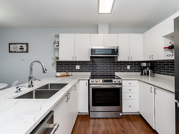 Updated kitchenQuartz countersCozy gas fireplaceVinyl and laminate floorsPrivate patioFinished single car garage