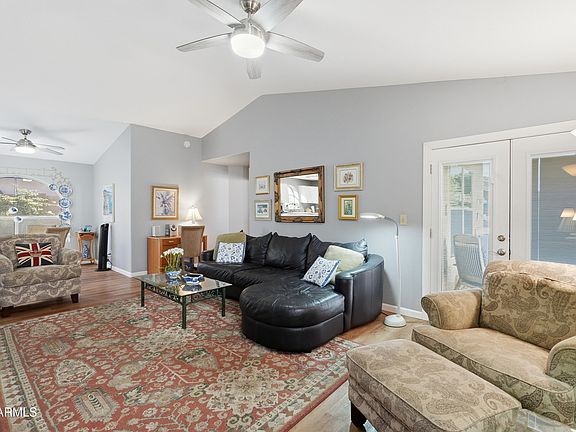 This single level home in Lakeside at Arrowhead is a charmer! This bright and tidy move-in ready home offers a spacious living room with vaulted ceilings open to dining and kitchen with upgraded countertops, plus two-tone paint and LVT flooring throughout. Generous owner's suite with separate tub & shower plus walk-in closet, the 2nd and 3rd bedrooms are split. Low maintenance front yard and a delightful backyard with lush green grass and shrubbery. Newer AC(2024) and roof underlayment (2018). Extra storage with a plethora of attached garage cabinets. Easy access to 101 freeway, Arrowhead Towne Center, golf, hiking and more.