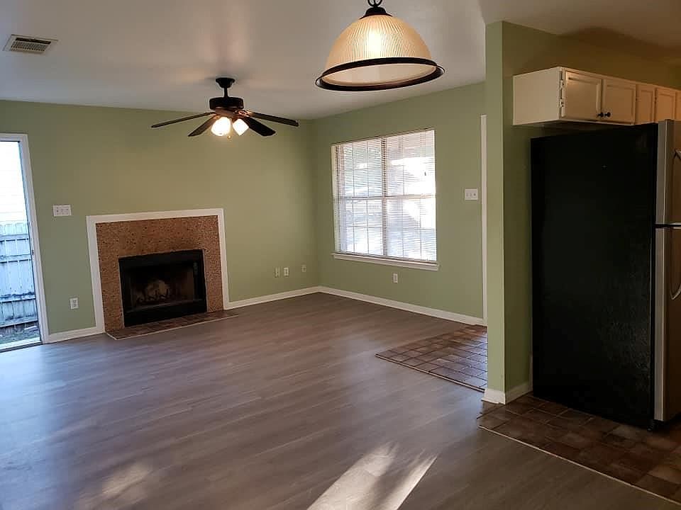 READY FOR MOVE IN, first qualified app accepted! BIG remodel done 18 months ago, included new vinyl plank flooring throughout, complete interior paint, new stainless steel appliances includes 5 burner gas stove, new tile counter and backsplash, new fans, new blinds, new AC system and new gas water heater!Walk in closet in master. Garage with opener. Fireplace. Privacy fenced yard backs to greenbelt/trail, big flagstone patio in back. Pet friendly. Professionally managed, YELP! $1450 for 24 mo lease term