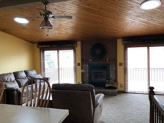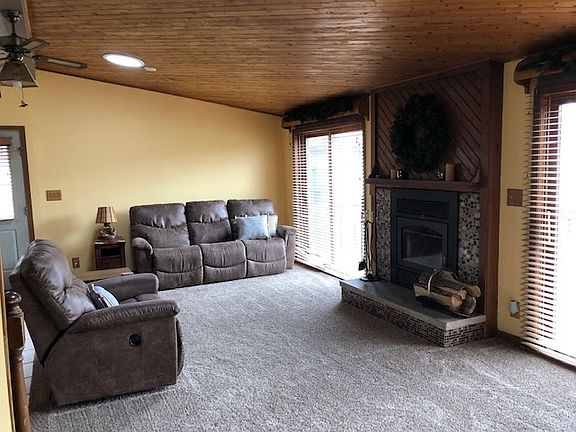 Nice ranch home with open concept kitchen and living room. The living room has a wood burning stone fireplace thats situated between two patio doors that leads to the front deck. The lower level has a big beautiful bar area and a family room with a pellet stove along with half bath and laundry . Some new paint and some new carpet. Come check out the 24 x 45 detached garage. Very nice. Outside has many nice trees, patio and a fire pit. Make your appointment today.