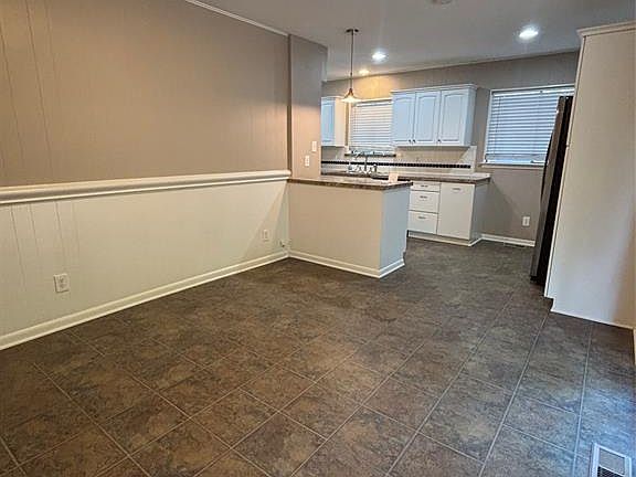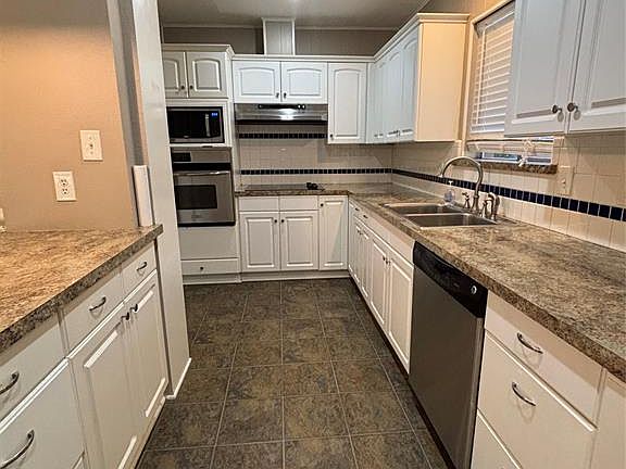 Stainless steel appliancesCovered patioBright functional kitchenVinyl and tile flooringAmple cabinet spaceSpacious fenced backyard