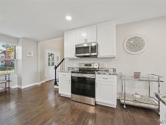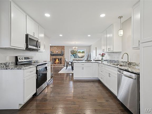 Inside, abundant natural light enhances the open-concept layout, complemented by modern lighting and rich flooring throughout the main level. The living area is anchored by a charming wood-burning fireplace, adding warmth and character to the space. Seamlessly connected, the dining area flows into a well-appointed kitchen showcasing white shaker cabinetry, stunning granite countertops, and sleek stainless-steel appliances—all designed for both style and practicality.