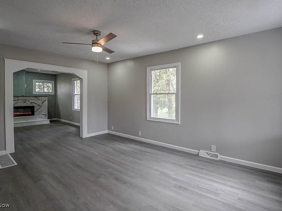 The covered front porch leads into a welcoming living room with recessed lighting and new vinyl plank flooring that continues throughout the home. Right off the living room, the family room offers a comfortable place to relax with an electric fireplace and access to a balcony porch overlooking the backyard.