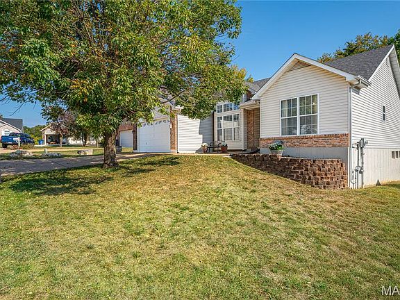 Welcome to this meticulously maintained 3 bed, 2 bath ranch home nestled in the heart of Festus. Spanning a generous 1,726 sq ft, this residence offers a harmonious blend of comfort + style, conveniently located near an array of restaurants, shopping, + entertainment with easy access to HWY 55. The main living areas are bathed in natural light, accentuated by a vaulted ceiling in the inviting living room. The expansive eat-in kitchen boasts custom cabinetry, stainless steel appliances, + a breakfast bar, perfect for gatherings. Retreat to the grand primary suite featuring a large walk-in closet + an en-suite full bathroom with double sinks. 2 additional spacious bedrooms in this divided bedroom floorplan ensure privacy. Enjoy the convenience of main floor laundry for added ease. The full walkout basement, equipped with 2 egress windows + rough-in plumbing presents endless opportunities to personalize + double your living space! Enjoy serene fall evenings on the freshly resurfaced back deck, all set on a flat lot backing to trees, complemented by an oversized 2-car garage. Your dream home awaits!