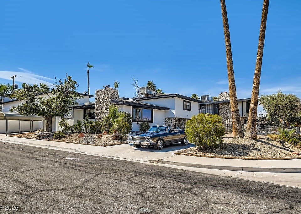 Step into this sprawling 4,500+ sq ft custom home, lovingly maintained and full of original charm. Situated on a generous corner lot in Crestview Estates, this unique two-story residence features 5 beds, 4 baths, and architectural charm rarely found today. Inside, vintage details shine: atrium-style windows, a decorative indoor fountain, classic stonework, and custom wood accents that reflect mid-century Las Vegas. The layout includes multiple living areas and flexible-use spaces to suit a variety of lifestyles. Out back, enjoy a private oasis with a diving pool, waterslide, built-in BBQ, and spacious patio ideal for entertaining. A semi-detached casita offers extra space for a pool house, studio, or home office. Additional highlights include a crescent driveway, detached carport, and mature desert landscaping. No HOA. Centrally located near downtown, the Arts District, and the Strip, this one-of-a-kind home offers space, character, and endless potential.