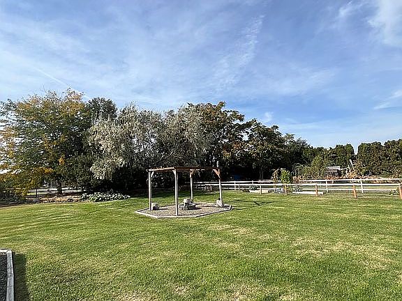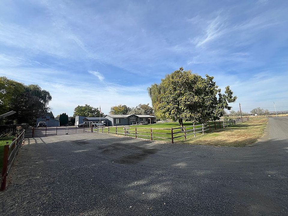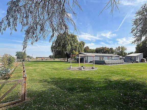 Country feel without the drive! This home is uniquely placed on an acre, providing lots of privacy and parking. 3+ bedrooms, 4th room pictured. It has its own well, and septic tank. This property is fully fenced and has underground sprinklers. Fenced garden space, with raised beds. Large barn with 2 bays, cement floors and has power. Retractable gazebo included, above ground pool included, carport included. Metal matching storage shed included. Dog kennel not included. Wood bbq gazebo not included.*Wood wall mount with Tv in living room, with included*