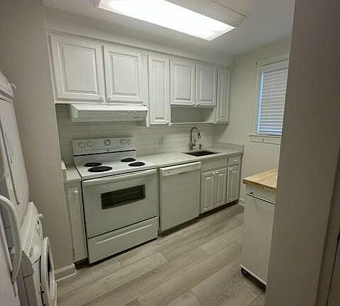 Step inside to find warm hardwood floors flowing throughout the living room, dining area, and bedrooms. The remodeled kitchen is a true standout with sleek white cabinets, elegant stone countertops, a stylish backsplash, and modern flooring that ties it all together. The bathroom is equally impressive, featuring a beautiful vanity and thoughtful finishes.
