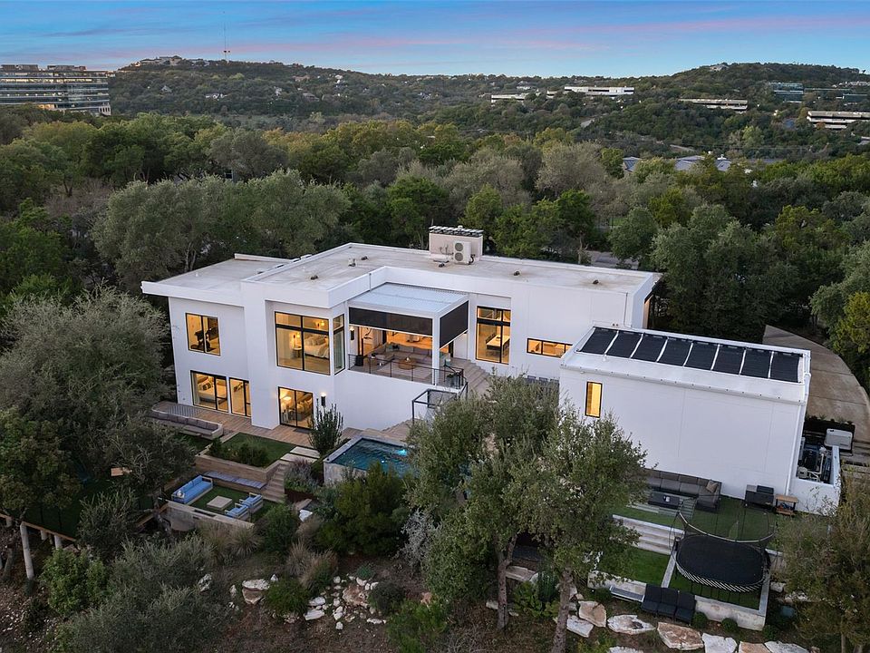 Set on a secluded 2.04-acre bluff, crafted by award-winning architect McKinney York—this residence offers a rare blend of contemporary sophistication and Hill Country serenity. Designed to embrace its natural surroundings, the home features expansive floor-to-ceiling lanai doors in both the living room and primary suite that retract completely, dissolving boundaries and opening the interiors to sweeping views of Wild Basin Preserve. The outdoor experience is exceptional and thoughtfully layered. The backyard unfolds across professionally terraced spaces with level turf, integrated planters, private woodland trails, and a dramatic gas fire pit positioned toward the valley. A remarkable 1,400 sq ft treehouse deck winds around mature oaks, creating a floating outdoor living space unlike anything else. A 500+ sq ft louvered pergola with motorized shade enhances year-round entertaining, while a heated pool with commercial-grade and solar systems ensures comfort in any season. Inside, the home’s clean, modern aesthetic is elevated by rich natural materials. A striking Leuders limestone fireplace anchors the main living area, creamy quartzite defines the kitchen and baths, and a sculptural glass-and-steel staircase adds architectural impact. The expansive indoor-outdoor all-weather terrace serves as the central gathering space, seamlessly connecting living, dining, and outdoor areas. A gourmet kitchen, dedicated office, media room, and en-suite guest suite complete the main level. The primary suite offers a private retreat with panoramic views, a spa-like bath, and an oversized custom dressing room that includes a dedicated cardio nook and its own washer and dryer. The lower level provides two additional bedrooms, a full bath, a media/playroom with terrace access, a full laundry room, and a dog wash station. Recent luxury upgrades—including multi-zone audio, PDLC smart-tint glass, premium water systems, and a whole-home generator—this estate delivers turnkey comfort.
