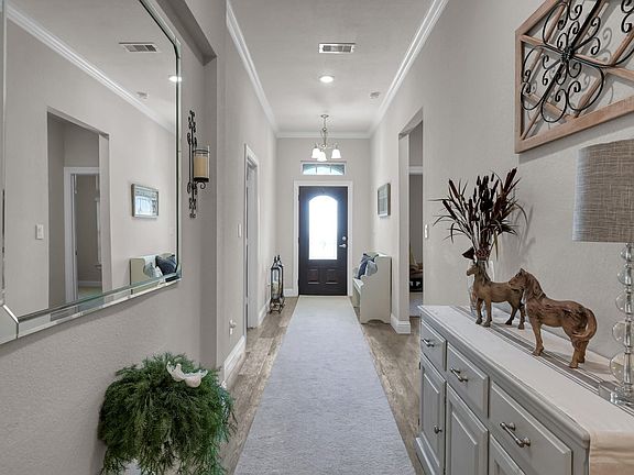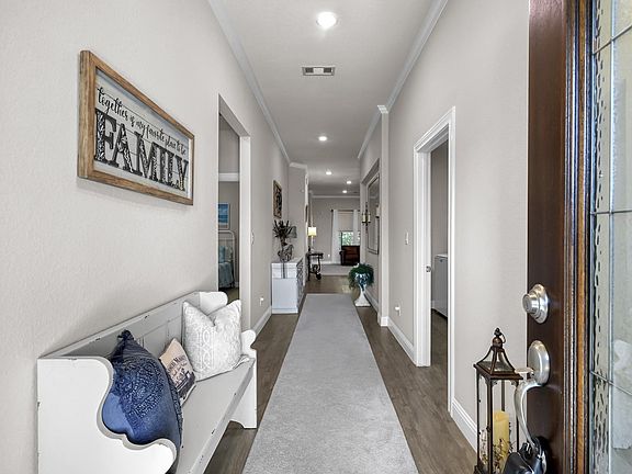 This beautiful one-story home in the desirable Mia Lago community features a warm entry and soaring ceilings. The kitchen boasts a gas cooktop, granite countertops, and a spacious walk-in pantry, with under-cabinet lighting and a breakfast bar for easy entertaining. It opens to the dining and family room. The primary bathroom suite includes a large walk-in closet, separate shower, soaking tub, and dual sinks. Throughout, you'll find crown molding, vinyl plank flooring, with carpet in the bedrooms. The screened back patio offers a relaxing space with a gas hook-up for grilling and a well-maintained backyard with no direct neighbors behind. Additional features include solar screens on double-paned windows, a new roof from 2021, a water softener, and a tandem oversized garage, as well as a transferable AC warranty.