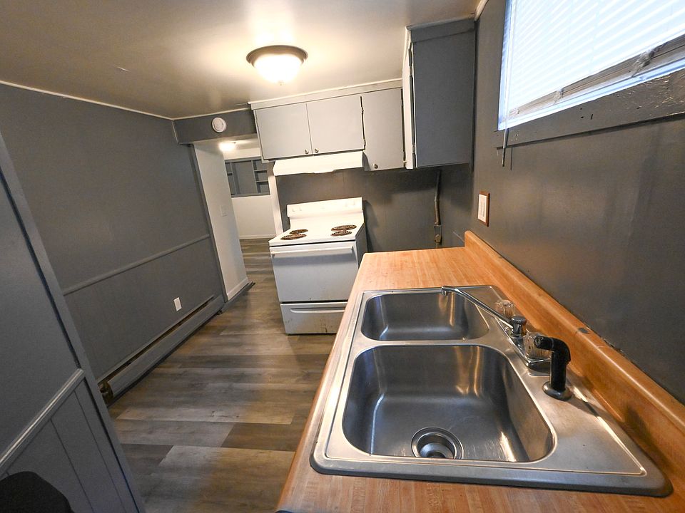 Kitchen area upon entryDrywall and windowsNew flooringLight fixtures