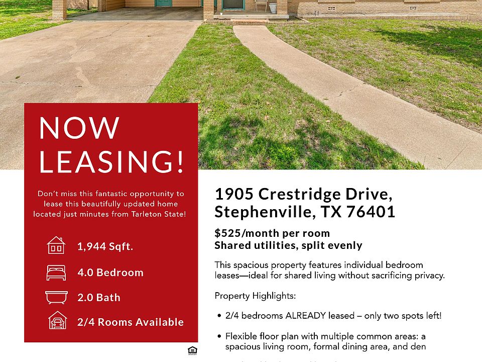Don't miss this fantastic opportunity to lease this beautifully updated home located just minutes from Tarleton State University! This spacious property features individual bedroom leases - ideal for shared living without sacrificing privacy.