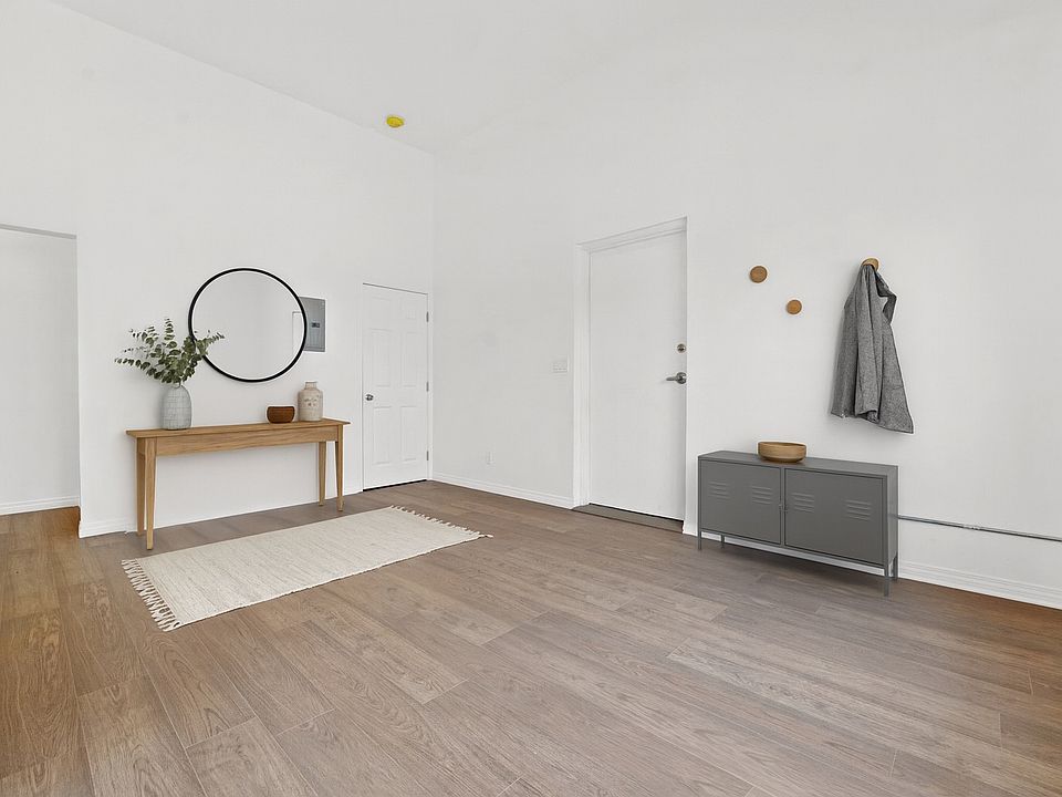 Open layoutLarge windowsNatural lightStainless-steel prep counterBright and inviting studioWood floorsAiry comfortable flow