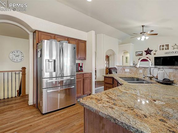 Gorgeous former model stucco rancher with easy access to Shriever AFB, Sits on 3+ beautiful acres with million dollar mountain views. Sit on your back low maintenance composite deck and just enjoy the beauty of Colorado! Open Floorplan with spacious main level master bedroom and attached 5pc bath with 3 sided fireplace, dual vanities, separate shower and jetted tub and walk in closet. Additional 2 bedrooms on main level. Formal dining room and large lovely kitchen featuring granite slab counters, stainless appliances, tons of cabinetry and breakfast bar with eating nook with walkout to back deck. Walk out basement with concrete patio, large family room, wet bar, theatre room and 2 additional bedrooms and bath. Oversized 4 car garage with workshop will surely please. New stucco 2020, new insulated garage doors with windows, New A/C Condenser and class 4 roof shingles. This home is made for entertainment. Come see you won't want to leave!