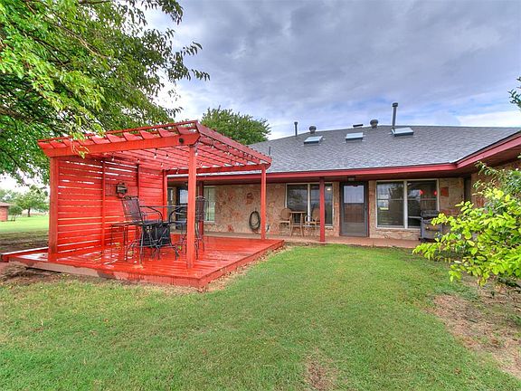 Family owned, unique custom home sitting on 1.59 acres with many entertaining options inside such as the game room with bar area or simply enjoy this winter sitting by your cozy fireplace watching Movies or Football. Head outside to the multiple areas to hang out with front row seats to watch Lake El Reno's annual Fireworks Show or walk down to the Lake to watch our annual "Smoke On The Water" boat races or enjoy our new Sunset Trails, used for walking, running and biking. Our Crimson Creek Golf Course is also a hop away and wraps around Lake El Reno. Home has an updated kitchen with new cabinetry and concrete countertops and Master Bath has been completely remodeled. The oversized 2 car garage has extra room for benches or storage. Schedule your showing today!