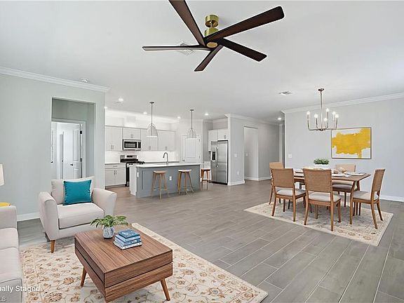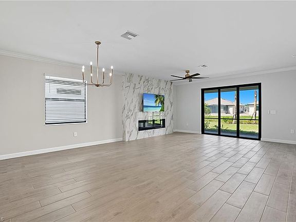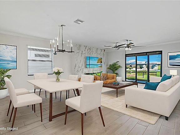 Welcome to 19053 Hinkley Drive, an exquisite brand-new, never-lived-in Trevi model located in the highly sought-after Verdana Village of Estero, Florida. This stunning four-bedroom, three-bathroom home offers 2,032 square feet of thoughtfully designed living space with luxurious upgrades and high-end finishes throughout. Step inside to an inviting open floor plan featuring tile flooring, recessed lighting, and elegant crown molding in both the living area and owner’s suite. The family room showcases a custom marble entertainment wall with a built-in fireplace and mounted TV, creating a warm and modern focal point. The gourmet kitchen is ideal for entertaining and culinary enthusiasts alike, featuring a spacious center island, stainless steel appliances including a gas stove, gas oven, cooktop, and refrigerator, a custom glass tile backsplash, a walk-in pantry, and a cozy breakfast nook. Each bedroom is generously sized and includes walk-in closets, while the bathrooms offer dual vanities and upgraded custom glass shower doors. The owner’s suite is a private retreat with a spa-inspired en-suite bath and designer finishes. Step outside to a private, covered lanai with northern exposure, beautifully enhanced by a stone feature wall with a fireplace and mounted TV—creating the perfect setting for outdoor relaxation and entertaining. Additional upgrades throughout the home include a built-in entertainment center, fireplace and TV in the living room, designer fans and lighting, custom tile accents, Laudry room cabinets and an epoxy-coated garage floor. Located in a no-flood zone, this home offers peace of mind while being conveniently close to beaches, shopping, dining, and Southwest Florida International Airport. Verdana Village residents enjoy exclusive access to a wide array of world-class amenities such as indoor and outdoor pickleball courts, indoor and outdoor tennis courts, a state-of-the-art fitness center, an indoor sports complex, a resort-style outdoor pool with a full-service pool bar, onsite dining at the Drift Restaurant and Craft Lounge, as well as a kid’s playground and dog park. For added convenience, residents have golf cart access to nearby retail shops including Publix, Dunkin’ Donuts, the UPS Store, Fifth Third Bank, and New York Pizza and Pasta. This is your opportunity to own a designer-upgraded, move-in-ready home in one of Southwest Florida’s most dynamic communities. Embrace the Florida lifestyle where every day feels like a vacation. Schedule your private showing today!