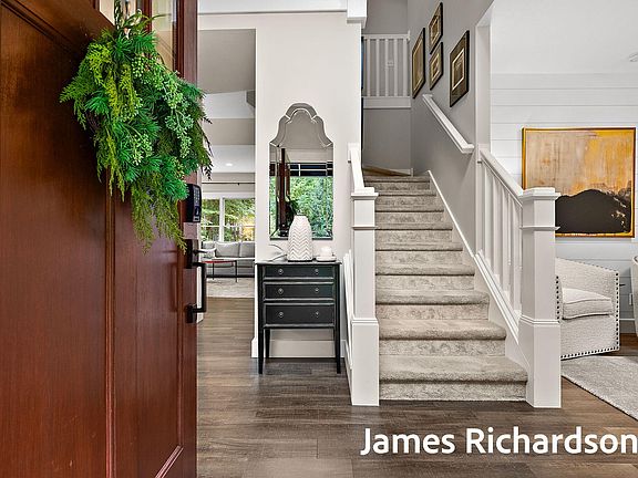 Upgrades galore! Make memories in this stunning, fully upgraded home offering superior craftsmanship and a true turn key living experience. The kitchen and laundry were both remodeled in 2022 showcasing luxury finishes, timeless style and meticulous attention to detail. The kitchen stands out with stainless Bosch and Wolf appliances, a custom stove vent, custom cabinets, quartz countertops, peninsula, and a custom tile backsplash all surrounded by beautiful lighting as well as a 2-way fireplace to the living room. The oversized remodeled main floor laundry features custom cabinets with quartz countertops, broom closet, and a built-in bench all conveniently located near the back entrance. Other main floor upgrades include LVP flooring throughout, half bath remodel from floor to ceiling with shiplap in the front room and hallway. Natural light anchors an open layout linking kitchen, dining and living areas- easy for everyday life and effortless entertaining. Upstairs, bedrooms are comfortably scaled with a full bath, new carpet, added shiplap and fresh paint. The expansive primary suite serves as a peaceful retreat, featuring a fireplace, built-in benches and custom ensuite and closet designed for beauty and functionality. Completely finished basement, with brand new carpet (10-2025), an added room with shiplap and LVP flooring, as well as built-ins and extra areas for storage, this space blends comfort and leisure. Outdoors, nestled within trees enjoy seasonal lake views as well as entertaining on an expansive Trex deck with built-in hot tub. From its exquisite standard throughout, this home checks every box and offers the ultimate blend of quality, style and retreat.