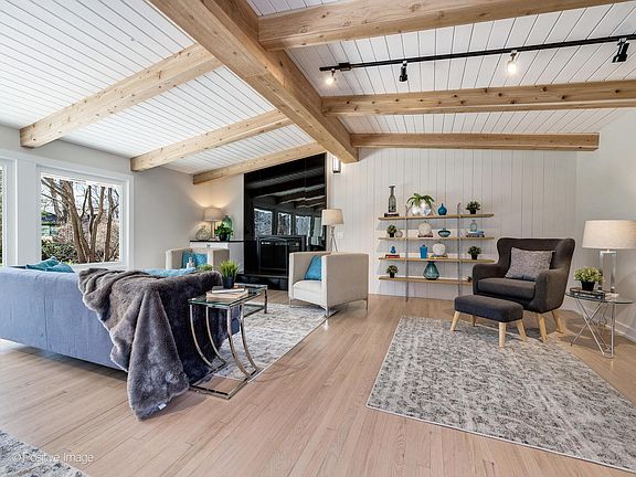 Rarely available 4 bed, 2.5 bath, Mid Century Modern home in Highland Park's coveted Sherwood Forest neighborhood! Walk into the beautiful and open great room to floor to ceiling windows and tons of natural light, stunning wood beamed ceilings, floor to ceiling fireplace, and impressive architectural details. The living room is ideal for entertaining, surrounded by picturesque windows in a very private and peaceful setting. A beautiful kitchen features new white shaker style cabinets, all stainless steel appliances including double ovens, and designer fixtures and finishes. The combined dining room overlooks the beautiful outdoors through custom windows. Kitchen includes an eat-in area and door leading out to patio and lush yard. Three large bedrooms on the second floor with master bath and additional full bath. Lower level includes fourth bedroom, large recreational room plus separate office, plus plenty of flexible space that can be used as fitness room, music room, study, den, game room, and more. Beautiful street with mature trees and spacious lots. Easy access to Lake Michigan, highway, transportation, and downtown. Steps to so many of Highland Park's top rated parks. This is the perfect home to make yours today! Agent Owned/Interest.
