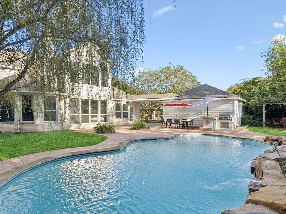 Sparkling poolGas-log fireplaceOpen floor planPrivate backyard oasisHigh ceilingsTwo-tiered wall of windowsStainless steel appliances