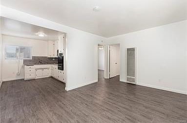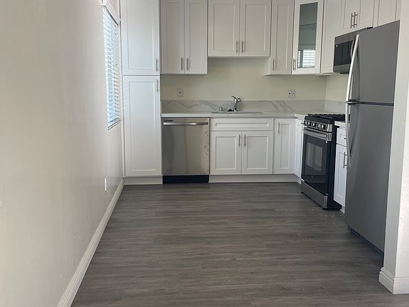 Great Location - First floor end unit with neighborhood views - Beautifully remodeled 2 Bedroom + 1 Bathroom apartment with 2 parking spaces. New paint, new floors throughout, new kitchen cabinets, new engineered-stone countertops and stainless-steel appliances. Includes stove/oven, dishwasher, microwave and refrigerator. Kitchen opens to large Living Room and has Laundry area inside, with bright natural light. Ceiling fans throughout the home. There are 2 nice size Bedrooms with a convenient hallway Bathroom. This is an 6 unit building with plenty of sunlight. This unit comes with 2 parking spaces; 1 garage space and 1 designated driveway parking space for this unit.