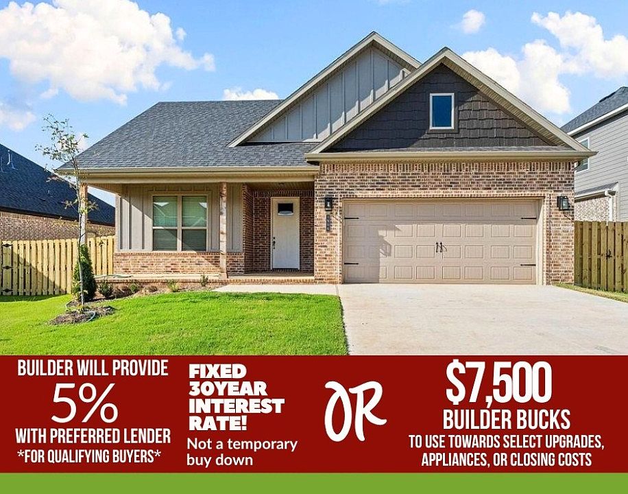 Welcome to Pea Ridge a Fast-Growing Community!Discover the perfect blend of comfort and convenience in the Yorktown subdivision, where you'll find scenic beauty, top-rated schools, and nearby parks. This Stork Plan home offers 4 spacious bedrooms, 2.5 bathrooms, and thoughtfully designed living spaces that feel bright and inviting.Step inside to luxury vinyl plank flooring and an open-concept design where the kitchen, living, and dining areas flow effortlessly together. The kitchen is a chef's dream, featuring ample storage and a walk-in shelved pantry. Outdoors, enjoy covered front and back patio--perfect for relaxation and entertaining. For a limited time rates starting at 4.99% OR $7,500 from builder & up to $4K from the builder's preferred lenders. For access to see all the homes stop by the model home at 1602 Christman St. Open Monday, Tuesday,Thursday, and Friday from 10-4 and Sunday 1-4.
