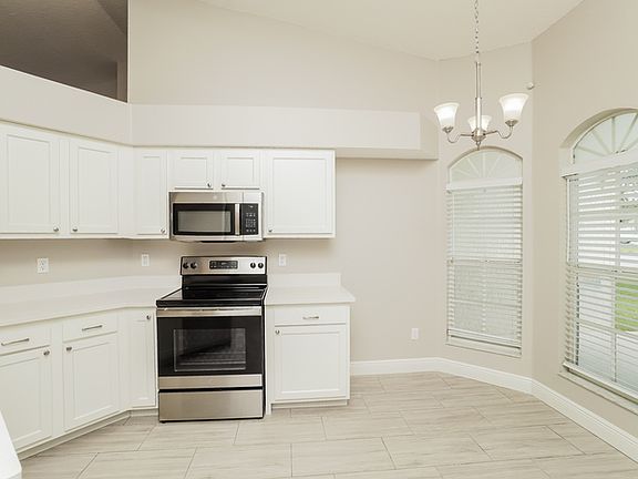 Step through the front door into an open layout filled with natural light. The spacious living area features tile flooring throughout, setting a clean, cohesive tone that extends to the kitchen and dining space. The kitchen combines both form and function with white cabinetry, stainless steel appliances, and plenty of counter space for effortless meal prep. Just beyond, the dining area overlooks the screened-in sunroom, providing a seamless indoor-outdoor connection ideal for relaxation or entertaining.