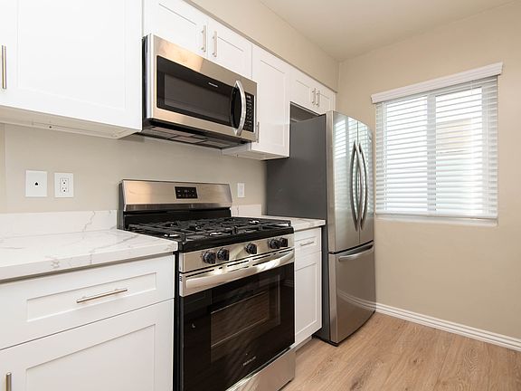 Key Turn Ready for NEWLY renovated 1 bedroom 1 bath apartment home boasts 800 sq ft. of living space! Featuring NEW laminate flooring complimented by custom accent walls and many other upgrades throughout. As you enter, the living and dining room you will notice the spacious open floorplan with lots of natural light. There are sliding glass doors that lead onto a very large outdoor patio space. The stunning kitchen is equipped with NEW premium stainless steel appliance package, NEW quartz countertops, up to date fixtures and ample cabinetry. The adjacent dining area has a chandelier for a personal touch, with a great view of the spacious private patio with an A/C wall unit that cools the entire space. As you enter the hallway, there is a floor to ceiling linen cabinets for needed storage space. The bedroom has double mirrored closet doors with a nice window for more natural light. The hallway bathroom has a NEW quartz vanity, glass shower doors with NEW custom quart tile in the tub/shower combo and designer mirror that makes this apartment shine with all the modern upgrades. This sophisticated and huge apartment home that can easily accommodate work from home office. Nice 10 unit building in a quiet Palms neighborhood with intercom entry into a nicely landscaped courtyard, covered assigned parking and on-site laundry facilities. Recently completed earthquake retrofit project. Professionally managed and online rent payments available. Excellent Palms location with great restaurants, shops and many entertainment options close by. Short drive to Sony Pictures Studios. Conveniently located near UCLA, USC, LMU, SMC, and WLAC. Easy access to 405, 10, and 90 Freeways, LAX Airport and Expo Line. Close to Westwood, Westside Pavilion, Century City, and Beverly Hills. TERMS: $2,195 12 MONTH LEASE $2,195 SECURITY DEPOSIT $1,200 OFF FIRST MONTH'S RENT* Owner pays for water and trash