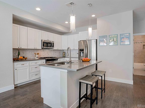 Immaculate townhouse with a rooftop deck in the desirable Edgewater community! Unbeatable location near the beautiful Sloan's Lake. Spacious and bright, this four-bedroom is a newer build (2017) and features high-quality upgrades throughout. The exquisite kitchen is graced with quartz countertops, upgraded cabinetry with undermount lighting, newer stainless steel appliances (2018), and an island with space for seating. Engineered hardwood floors flow from the kitchen into the sunlit living room. On the third level, the master suite is appointed with a walk-in closet and opulent three-quarter bathroom with a quartz-topped vanity and upgraded finishes. Enjoy ample space to spread out: this home presents an additional three well-sized bedrooms and three full bathrooms! A laundry closet with a newer washer and dryer (2018) completes the interior. Rest easy knowing your home is secured with a Ring doorbell. Spend time outdoors on the expansive rooftop patio with an included hot tub (2018) and incredible views. Park with ease in the two-car attached garage complete with hooks and ski racks. Walking distance to Sloan's Lake and 290-acre park, as well as the trendy Edgewater Marketplace, Joyride Brewery, Edgewater Fitness Center, Target, King Sooper's, Ace Hardware, and more! Easy access to I-70, I-76, and 6th Avenue. Don't miss out on this remarkable opportunity in one of Denver's hottest neighborhoods!