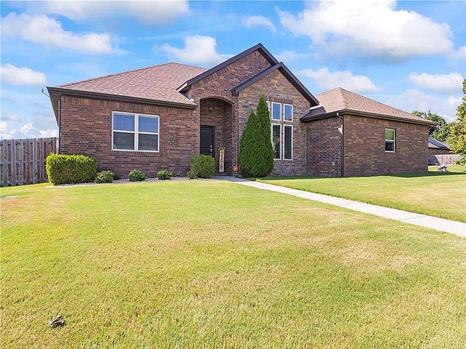This Gorgeous All Brick home features a great split bedroom floor plan with 3 bedrooms, 2 bathrooms and 2 car garage. Beautiful kitchen with granite countertops, formal dining, breakfast nook, and lovely living room with gas fireplace. Large primary bedroom and the primary bathroom includes a large double sink vanity, walk in shower, and jetted tub. This home is located on a corner lot with an outstanding lawn. The large backyard is fenced for privacy, and you will love entertaining or enjoy quiet nights sitting on your covered patio with gas fireplace!! Great location less than 10 minutes to I-49. Community pool and playground area.