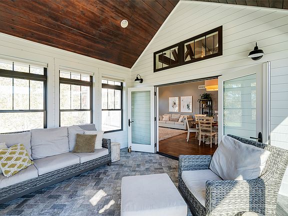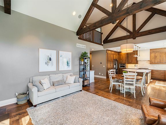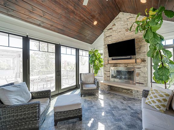 Every inch of this architectural custom home reflects timeless craftsmanship and refined modern design. Tucked into the heart of Prairie Trail, it was thoughtfully planned for everyday living and entertaining. The open layout connects a vaulted great room with a two-story stone fireplace, reclaimed oak ceilings, and rift-sawn white oak floors to the 2024 kitchen redesign featuring quarter-sawn oak cabinetry, handmade Cle Zellige tile, and KitchenAid appliances. The four-season room with heated tile floors and 16 bi-parting doors opens to an outdoor kitchen with Hestan grill, refrigerator, sink, and fire pit surrounded by buff-cut limestone landscaping and WiFi irrigation. The main-level primary suite features custom wood paneling, heated tile floors, a hidden pocket office, and a digital multi-head shower. Upstairs offers three bedrooms, a full bath, and loft; the lower level showcases reclaimed oak beams, a theater-style family room, custom wet bar with GE Monogram appliances, and a guest suite. Additional highlights include a new roof (2025), geothermal system, dual 80-gallon water heaters, full landscape lighting, invisible fence, and epoxy-finish garage with stainless cabinetry and built-in refrigerator/freezer.