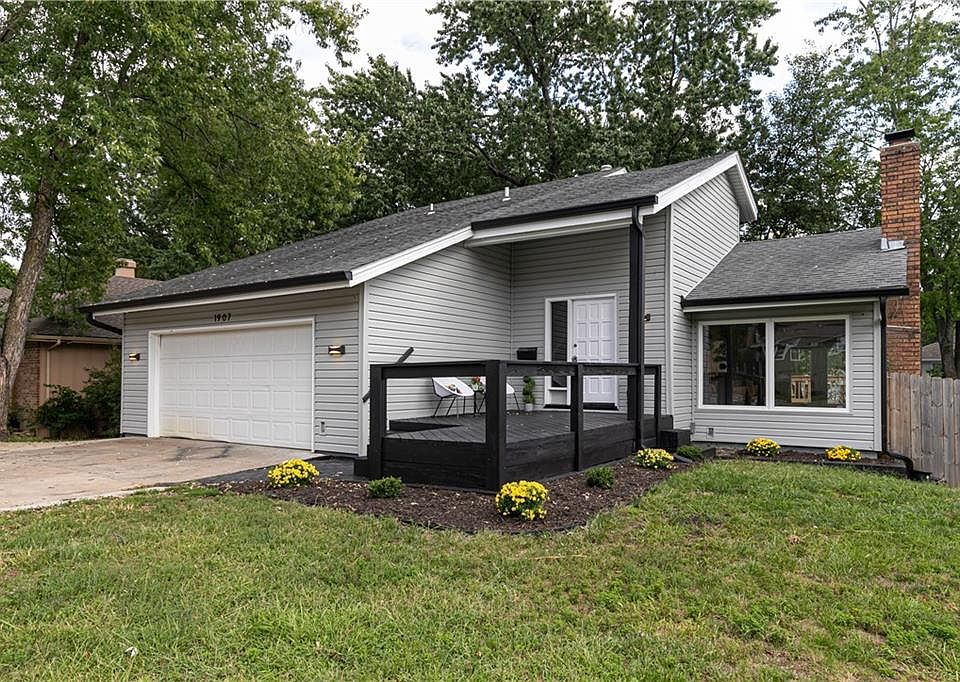 Welcome to your dream home! Nestled in the heart of Lees Summit this stunning 5-bed (with a 6th non-conforming bedroom), 2.5-bath home offers everything you desire. Walking through the front door, you are greeted by the grandeur of vaulted ceilings, wide open floor plan and fireplace, creating an expansive atmosphere throughout. The openness continues as you explore the main level, where you'll discover a charming kitchen and dining room. They are the perfect setting for hosting elegant dinner parties or enjoying memorable family meals. The updated kitchen boasts modern appliances, ample hard surface counter space, updated flooring, and an abundance of storage, making it a delight for any culinary enthusiast. Upstairs, you'll find three generously sized bedrooms, providing comfort and privacy for the whole family. The primary suite offers a peaceful retreat, complete with a built-in make-up table. The remaining bedrooms are versatile and can easily be transformed into home offices, guest rooms, or playrooms to suit your needs. The lower level offers additional living space, bedroom with egress window, a 6th non-conforming bedroom, a huge bar, and storage space. One of the many highlights of this home is the 3 levels of living space with 2 bedrooms on each level. Venturing outside, you'll discover the massive 2 tiered deck, a fenced-in backyard, offering a safe and secure space for children and pets to play freely. Enjoy peaceful evenings while being within close proximity to schools, parks, shopping centers, and other amenities. Don't miss out on the opportunity to own this wonderful home!