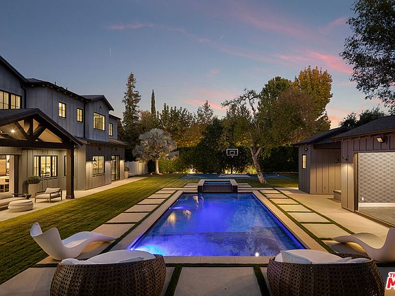 Located in a tranquil pocket south of Ventura Boulevard, this newly constructed modern farmhouse redefines luxurious living in Tarzana's most sought-after enclave. Perfectly blending contemporary elegance with timeless warmth, the estate is securely gated and enveloped by mature, verdant landscaping, offering privacy and serenity in equal measure.A showcase of impeccable craftsmanship, the residence features striking wide-plank white oak floors with intricate custom inlays and a dramatic double-height entry foyer that sets a tone of understated grandeur. The curated, open-concept layout balances flow with purposeful room separation, delivering both expansive spaces for entertaining and intimate gatherings.The heart of the home is an exceptional chef's kitchen, appointed with top-tier Thermador appliances, an oversized marble island, bespoke cabinetry, and a breakfast nook with views of the lush backyard. A custom glass wine closet and wet bar complete this culinary sanctuary, with an elegant, adjacent formal dining room. The living room, framed by beamed ceilings and a beautiful custom fireplace, seamlessly connects to the outdoor lounge patio and backyard through fully retractable, sliding glass doors. Beyond the interiors, the sprawling outdoor grounds are a private oasis, featuring a generously sized pool and spa, a fully-equipped BBQ station, fire pit, and a sport court for active recreation. A detached bonus room with a dedicated bathroom offers endless possibilities, from a home gym to a creative retreat. Every inch of this home reflects meticulous attention to detail, from its modern amenities to its thoughtfully designed finishes, ensuring both beauty and functionality. Set in a distinguished neighborhood known for its excellent school district, this estate is ideally situated near the dynamic offerings of Ventura Boulevard, including upscale shops, renowned dining destinations, and lively nightlife, combining convenience with an elevated lifestyle. An unparalleled retreat, this property is a rare fusion of architectural ingenuity, and is not to be missed.