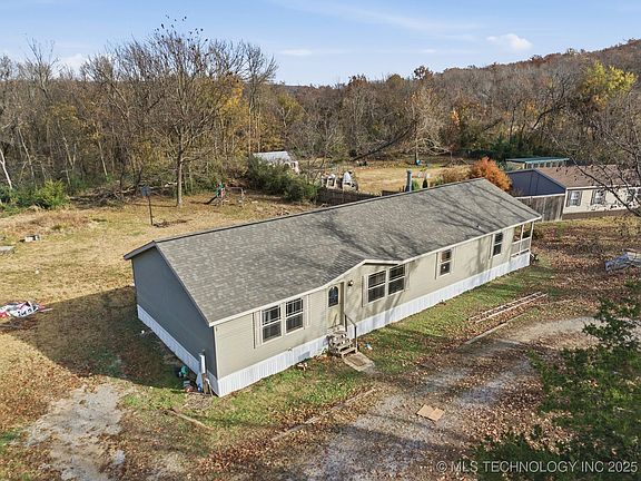 Lots of updating in this doublewide mobile home on 1 acre that sits conveniently on a shared private road off E 490 Rd (Hwy20) and Will Rogers Turnpike! It features two living areas, woodburning fireplace, an above ground pool w/ liner and storm shelter. New Hot Water Tank (Jan 2024), Fresh Paint throughout (Mar 2025), New Roof (Dec 2024), New HVAC (Mar 2025). Seller is offering $5,000 flooring allowance w/ strong offer. All appliances stay!