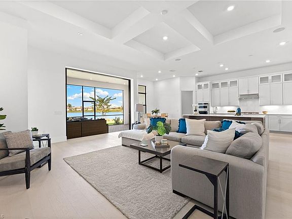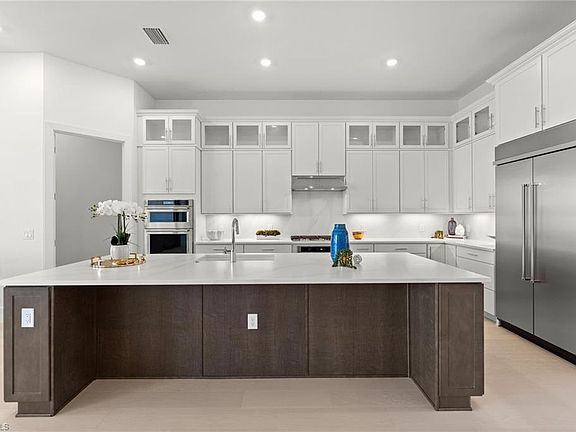 Come see why this new construction Verdana Village Layton home is one of the most desirable in the community. The Ranch style home offers nearly 3,000 sq. ft. of living space on a premium west-facing lakeview lot offers stunning sunsets and designer finishes throughout, including newly added hardwood on the first floor. This home is part of Pulte’s larger Echelon series, sitting on a generous 66-foot-wide homesite for extra space and privacy. The exterior features a brick paver driveway, adding to the home’s curb appeal. The sought-after Layton floor plan features soaring ceilings, three bedrooms plus a den, tray ceilings in the living room, primary suite, and den, and an open layout blending formal and casual living. This split floor plan provides privacy and space, with bedrooms thoughtfully separated for comfort. Bedroom 2 boasts a bay window, while bathrooms showcase elegant tile finishes. The gourmet two-tone kitchen is a showpiece, featuring warm cabinetry on the designer island paired with white perimeter cabinets for a balanced warmth. Additional highlights include double-stacked cabinets with glass fronts, recessed lighting, a large walk-in pantry, a built-in KitchenAid stainless refrigerator, a gas cooktop, wall ovens & gas cooktop, quartz countertops, and island seating—perfect for entertaining. Additional highlights include a full laundry room with cabinetry & sink just off the 3-car garage, a lanai plumbed for an outdoor kitchen, and new bath vanity light mirrors. Verdana Village offers a true resort-style lifestyle, featuring an impressive indoor sports complex with pickleball, tennis, and basketball courts, a resort-style pool, a cutting-edge fitness center, and a variety of social spaces, including an on-site restaurant and bar, café, plus craft cocktail lounge. The Paradise Patio poolside lounge invites relaxation, while golf cart access to the Shops at Verdana Village ensures effortless trips for dining, groceries, coffee, and daily conveniences. Buyers have the option to purchase it with fully staged furnishings; this home allows for an effortless, turnkey move-in. Additional premium features include impact-rated windows and doors, Nest doorbell and thermostat, and a transferable 10-year Pulte Warranty + more. This brand-new luxury home awaits the buyer looking for the ultimate Florida lifestyle. Come see today!