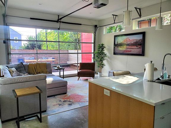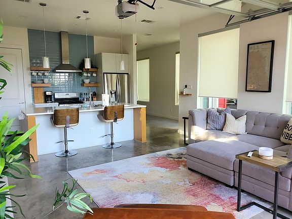 This modern lock-and-leave is filled with sophisticated finishes, 3 smart TVs, a Nest thermostat and lots of natural light. Multiple living areas seamlessly blend indoor-outdoor living, including a covered carport that doubles as a patio. The fully xeriscaped yard requires only minimal upkeep. The main level features stained concrete floors, high ceilings and a translucent garage door that with the touch of a button opens to the front patio. On this level you'll find the living room with a 75-inch wall-mounted TV, the kitchen with a large pantry, two bedrooms, a full and a half bathroom as well as washer and dryer. The upstairs features pecan wood floors and an open office/study with a built-in book shelf. The expansive wrap-around sun deck leads to the master bedroom with a customized walk-in closet and a large double-sink bathroom. Location: The home is conveniently located within a 2-block walk to all of East Austin's favorite spots, a 6-minute drive downtown and a 15-minute drive to the Austin International Airport. Flexible lease term between 3 to 9 months with a utility flat-rate of $200/month (includes water, gas, electricity, trash pick-up, Google Fiber Internet, Netflix & Hulu).