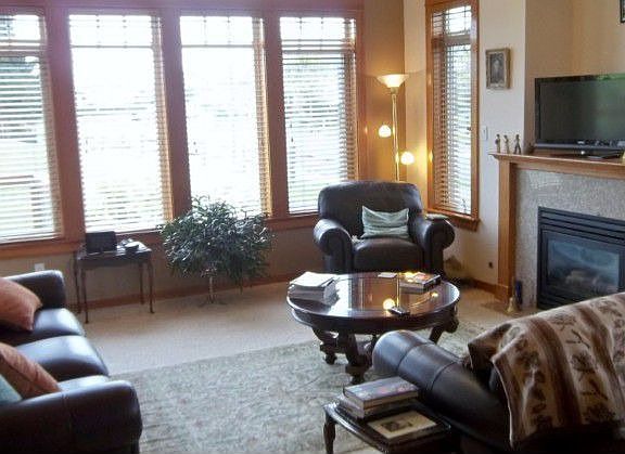 Fabulous golf course living with sweeping mountain views await you from this deluxe 2,008 sq ft home. Features both a main floor master suite and private upstairs suite with balcony deck. Spacious great room with gas fireplace, slab granite, & cherry cabinets in kitchen, large laundry rm, & library/den. Situated just behind the 17th tee box means no stray golf balls. Since it's not a condo you don't have to pay those expensive HOA fees but still benefit from a very low maintenance property.