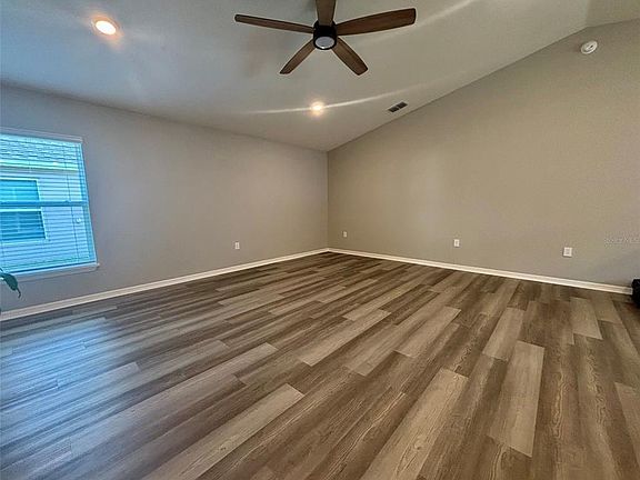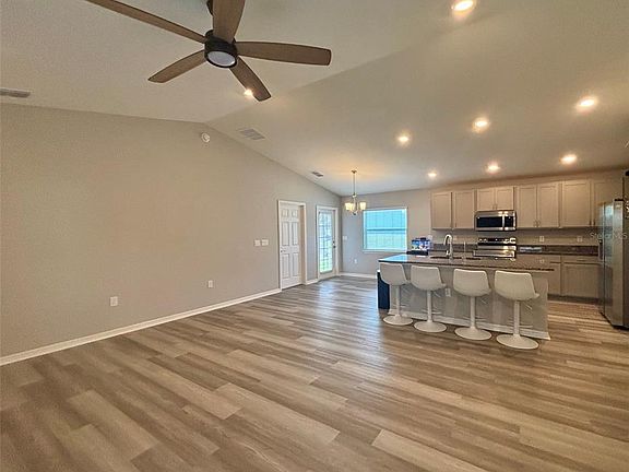 Brand-new construction home featuring 3 bedrooms, 2 bathrooms, and a spacious open-concept layout all on one level. Enjoy energy savings with solar panels already installed and fully paid by the landlord, significantly reducing your utility costs. The gourmet kitchen includes granite countertops, Samsung stainless steel appliances, a pantry, and a large island. Durable luxury vinyl plank flooring extends through the living areas, bathrooms, and laundry room, while stain-resistant carpet adds comfort to the bedrooms. The private owner's suite features a walk-in wardrobe and an en-suite bath with dual vanities, a tiled walk-in shower, and a separate water closet. Additional highlights include a covered lanai, 2-car garage, custom-fit window blinds, energy-efficient windows and insulation, and included professional landscaping. Modern living meets energy efficiency in this beautifully designed home move-in ready and built for comfort and savings.