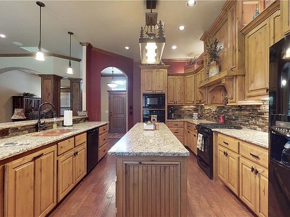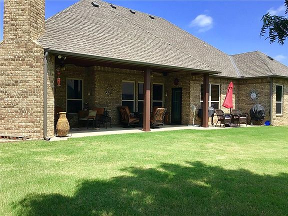Beautiful custom built one owner home. Attention to detail & pride of ownership is evident throughout. You will love the Knotty Alder Pine baseboards & interior doors throughout, large utility room with built in mud bench, surround sound speakers wired to the kitchen/dining/master/front room, oversize garage with a storm shelter, plantation shutters & Bosch dishwasher. West interior living room wall is insulated to reduce noise to the 2nd bedroom. Patio speakers are hard wired so you can enjoy your evenings watching the game or listening to music while the peaceful rock waterfall flows nearby. The outdoor fireplace provides the final touch! Video camera security system offers additional peace of mind. Neighborhood community features a large salt water pool, fantastic clubhouse, & ponds! Kitchen has a breakfast bar, an oversized island with lots of storage, a pantry with pull out shelves, a gas stove, and double ovens, one that is convection. Ceiling fans & crown molding throughout.