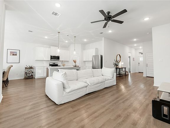 Open, spacious and bright ~ This 4 bed 2 bath like-new home sits at the end of a cul-de-sac and has it all! The layout offers a three way split floor plan with the primary suite privately tucked away at the rear of the home, a secondary bedroom having it's own wing, and the third and fourth bedrooms with a full bathroom at the front of the home. Not only does the living area's high ceilings, large windows, and natural light make this area feel and look large, this home has great sized bedrooms and closet space, with all three secondary bedrooms large enough to accommodate a king bed set! You'll appreciate this home's spacious kitchen with custom cabinetry, soft close drawers, ample cabinet and pantry storage, functional island, and stainless steel appliances, the primary suite's bedroom and closet having upgraded vinyl flooring along with it's double sinks, standing shower and soaker tub, the intricate tile you'll find in both bathrooms and laundry room, and smart home features. Relax in the evenings on the large extended back patio or on the front porch and enjoy having the privacy and space of the cul-de-sac right outside your door. This beautiful home is ready for new owners to love it as much as the original owners who selected all the finishes and upgrades to be built.