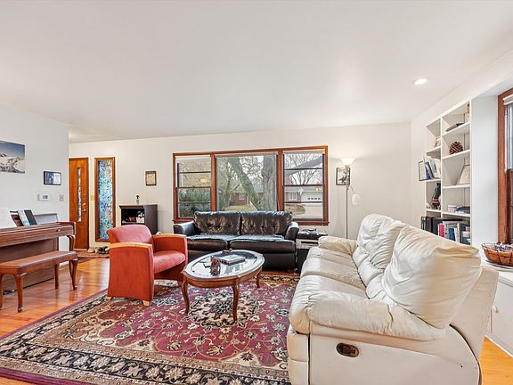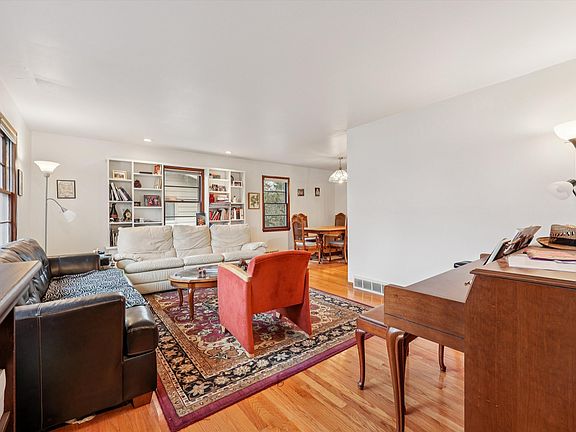 Inside, rich hardwood floors flow through the main living areas, bathed in natural light from generously sized windows. The living room is spacious and warm, creating a cozy gathering space for quiet evenings or lively conversations. Adjacent, the formal dining room invites gatherings — from dinners to festive celebrations.