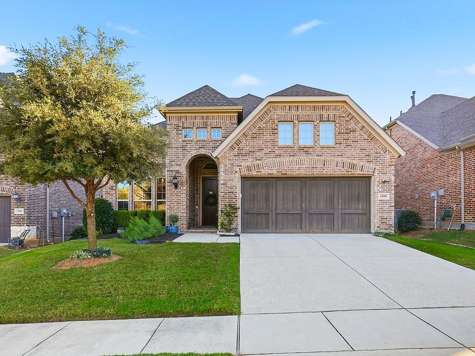 Beautiful Single-Story Home in Prime Lantana Location! Discerning buyers will love this stylish, 2019-built home located in a quiet cul-de-sac in the front section of Lantana. The elevated lot offers privacy in the backyard and quick access to major roads, shopping, dining, and DFW Airport (25 minutes). Inside, upgraded red oak hardwoods, custom cabinetry, specialty tile, and soaring ceilings create a warm, open feel. Architectural details—wood beams, a rotunda ceiling, and butler’s pantry—add character and charm, while curated light fixtures throughout elevate the look. The flexible front room can serve as a study, fourth bedroom, or chic “Speakeasy” lounge with its electric fireplace and moody vibe. The kitchen impresses with soft-close cabinets, pull-out spice drawers, glass-front uppers, and a custom vent hood. A butler’s pantry doubles as a coffee bar, and the oversized walk-in pantry is a dream! Light-filled living and dining areas enjoy south-facing windows, a vaulted ceiling with wood beam, and a cozy gas fireplace. The split bedroom layout ensures privacy for the spacious primary suite, featuring a stunning bath and large walk-in closet. A built-in mudroom off the garage entrance to the laundry area adds everyday convenience. Outdoors, the covered patio with vaulted ceiling and party lights sets the scene for easy entertaining, and the manageable yard keeps maintenance simple. Enjoy Lantana’s resort-style amenities—two fitness centers, five pools, tennis and pickleball courts, trails, and year-round community events. Front yard maintenance is included in your HOA fee. The newest elementary school is just two blocks away, and golf memberships are available at the Lantana Golf Club.