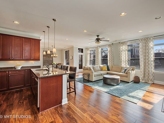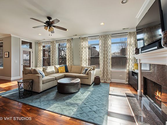 Welcome home to this spacious 3 bedroom, 2 bath home in a boutique, all brick, 12 unit ELEVATOR building. This home offers an open living concept w/ a spacious south-facing living rm, separate dining, split bedroom floor plan, & LAUNDRY RM w/ new LG side-by side W/D. Open kitchen features large granite island, breakfast bar, stainless steel appliances & 42" custom cabinetry. Spacious master suite w/ walk in closet, ensuite bath w/ soaking tub & sep glass shower. Two add'l spacious beds w/ ample closet space. Other unit features include: WB fireplace, high ceilings, crown moldings, NEW hardwood floors, custom blinds & drapery, central heat & air w/ Nest thermostat, & add'l in unit storage closet. The building provides a common roof top deck w/ city views and garage parking. Highly sought after Coonley Elementary School & steps from transportation, dining & entertainment, parks, and all North Center has to offer.
