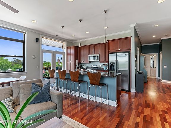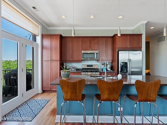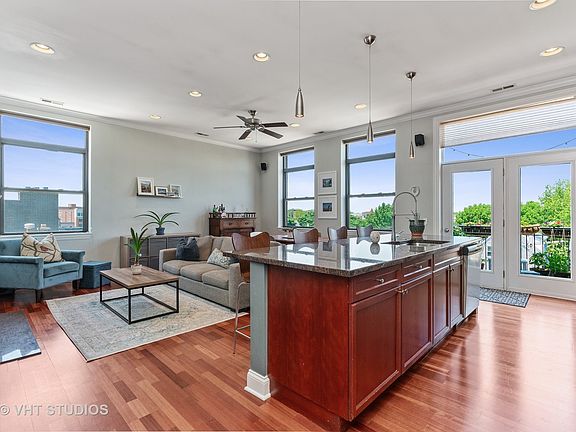TOP FLOOR--CORNER--OVER 1500sf! 3 Bedrooms + 2 Full Baths + Garage Parking Space & Storage INCLUDED IN PRICE!!! Ideal 'Open Concept', Split Floor Plan offers a 'Chef's' Kitchen featuring 42" Cherry Cabinets, Granite Counters, Stainless Steele Appliances & private Balcony--great for a BBQ! Cozy, wood burning Fireplace in Living Room & plenty of room for formal dining table. Quiet, residential side of the building--does not face Irving Park Road. Incredible natural light & hardwood flooring throughout. Great storage, ample closet space, an actual Laundry Room w side-by-side W/D, extra storage room & stairs to Rooftop Deck right down the hall! Sought after 'Level 1' Coonley Elementary School District. Boutique, all brick, ELEVATOR building with common ROOF TOP DECK-- 1 block from the Brown Line in phenomenal North Center/Lincoln Square location! Walk to restaurants, entertainment, Trader Joes, Parks & great shopping! No Rental Restrictions, 100% owner occupied, no special assessments, well funded building.