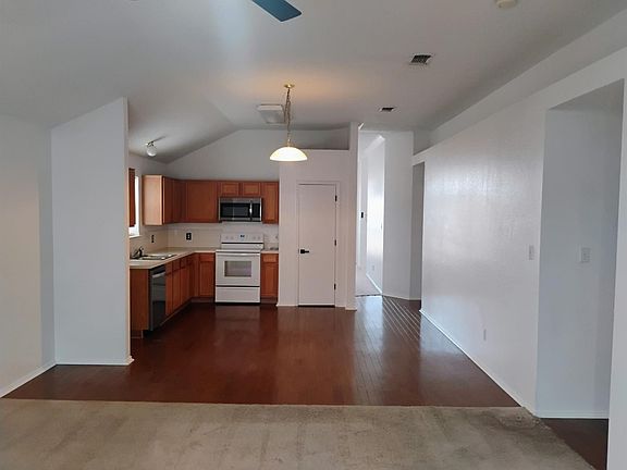 Traditional brick home in desirable Kirby Creek Village. Situated on an oversized lot with a spacious backyard and direct access to greenbelt. Open floor plan features formal living and dining area at the front of the home and a second living space off the kitchen at the back. Eat-in kitchen offers ample space for dining and entertaining. Interior includes a gas-log fireplace, wood flooring in kitchen and hallways, and carpet in main living areas and bedrooms. Convenient location near schools, shopping, and major highways.