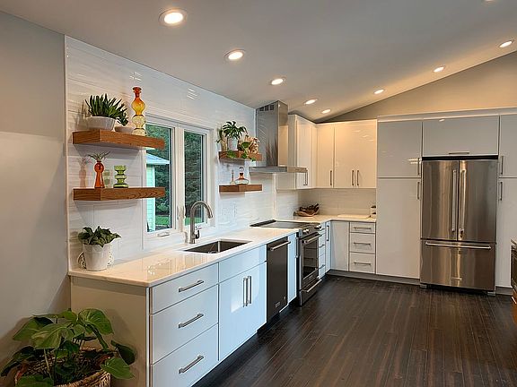 A beautiful fully renovated Mid-Century Modern 3 bedroom, 2 bathroom open concept home. Bamboo hardwood floors throughout. The master suite includes an additional upper office/lounge space. This home allows for 2 great hidden storage areas, 1 off the upper area of the master suite, and the second above the 2 car garage. Custom design craft made white kitchen. It is equipped with a custom made quartzite island, and marble countertops. With an open air interior courtyard, a raised deck off the dining room, a bricked wall fireplace in the living/sitting area and more! New roof in 2018, new plumbing, AC, heating, electrical, flooring in 2020.