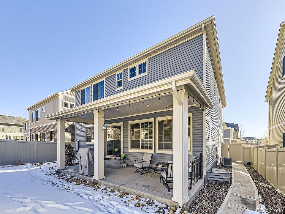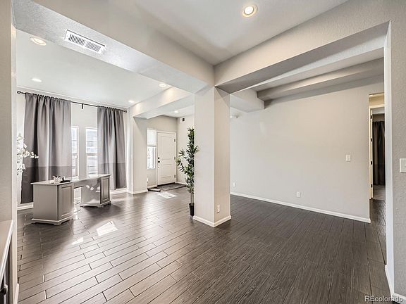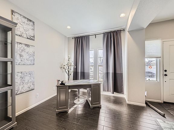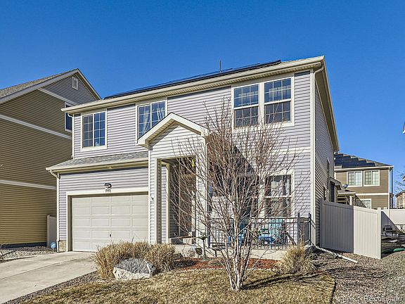 Welcome to this well taken care of home with thoughtful upgrades for not only functionality, but visual thrill. Upon entering the home, you will feel the sense of space with the high ceilings, upgraded 8 foot doors, upgrade moldings, and wood look tile flooring. Upgraded low pile carpet stays looking clean, and easy to take care of. Designer package choices were made when building the home including upgraded stainless steel - smudge proof appliance package, upgraded tile backsplash, oversized island and white quartz countertops. Enjoy the recessed lighting package for a more modern look, and the convenience of USB ports located in kitchen, office, and loft areas. Don't feel too bad for leaving the lights on, as the fully owned solar produces an average of 1190 KW per month. After a long day you can sit under the covered oversized patio in the back yard. Large enough to hold family gatherings and get togethers with friends. Be worry free about keeping the grass green. There are three zones and a drip system already in place. Security system is in place with outdoor camera, video doorbell, and lower level window alarms. In 2022 R50 pest control insulation was blown into the attic for extra energy efficiency. This home is truly spectacular in style and stands alone from the rest. Bring your inspiration for the unfinished basement. It is stubbed for plumbing, has egress windows and nine foot ceilings if you want more living space. Only ten minutes to DIA which makes this the perfect location for folks needing easy access to the airport. Call listing agent for more details, or to schedule a viewing.