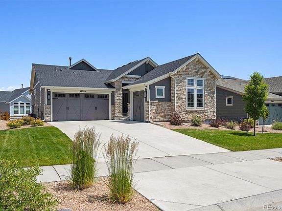 NEW PRICE! Welcome home to this beautiful, bright & spacious ranch style home in Arvada's highly desired Candelas community! This amazing Remington Home's Patio Home is lock and leave ready! Shoveling and grounds maintenance are taken care of for the owner by the HOA. Nicely appointed covered front porch, sunny south facing driveway, and great curb appeal! Oversized 3 car garage for all of life's stuff! Open floor plan with extensive hardwood floors throughout much of the main level & tastefully updated throughout! Living room is pouring w/ natural light, high ceilings, & a sleek gas fireplace. Gourmet kitchen features a large island with eating space, grey cabinets, stainless steel appliances, walk-in pantry, tile backsplash, quartz countertops, & comfortable dining area w/ access to the deck and fully fenced backyard. Main floor laundry w/ appliances included, offers great functionality. Conveniently located office/kids playroom w/ French doors! Primary bedroom is spacious offering coffered ceiling and 5 piece ensuite bath with large walk-in closet. Spacious secondary bedroom w/ adjacent full bath. Fully finished basement is the perfect space for entertaining with new plush carpet throughout, a cozy gas fireplace perfect for reading or relaxing. Two additional large bedrooms and beautifully finished shower bathroom. Large storage room with ample storage. This home has it all! Once outside enjoy the sunny south facing driveway, VERY low maintenance backyard and peek-a-boo mountain views! This outstanding community offers pools, clubhouse, multiple parks, biking trails, walking paths, community gardens and so much more! Live close to dining, brewery outstanding Three Creeks K-8 highly rated JeffCo school and Ralston Valley High is a 10 of 10 for college prep! Easy access to Boulder, Golden, Denver and a true sense of Colorado foothills living. Walk to Resolute or Bluegrass for happy hour! Don't miss this