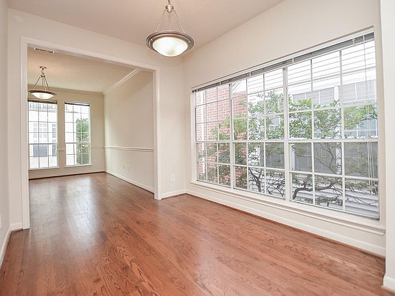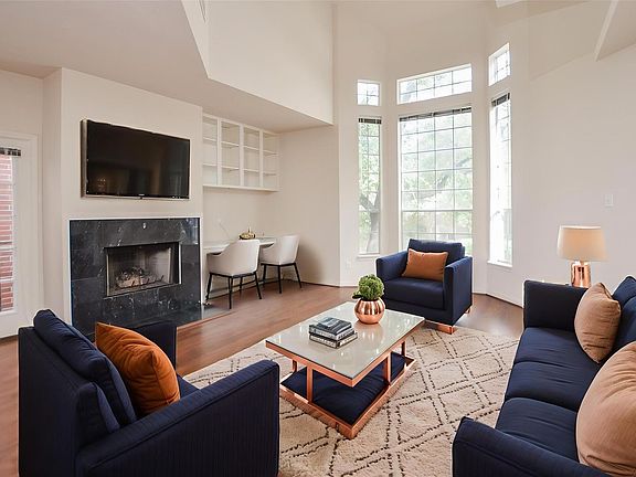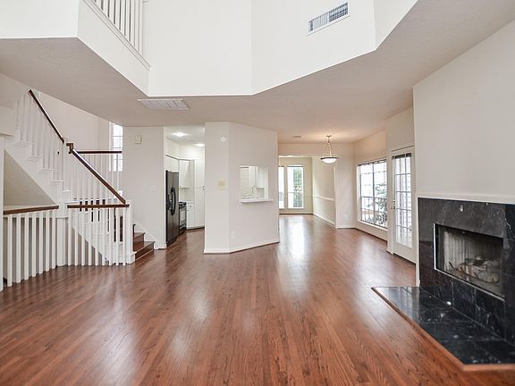 Welcome to 1909 Branard Street #B, a gated three-story townhouse tucked away in the Montrose area, just minutes from many of Houston's most popular destinations. This home features 2 spacious bedrooms, 2.5 baths, and soaring ceilings throughout. The second-floor living room is filled with natural light from the stunning bay windows and features wood flooring and a cozy center fireplace. It flows seamlessly into the dining area, creating an open space ideal for everyday living or entertaining. The kitchen is equipped with Formica countertops, recessed lighting, and ample cabinet storage. The third-floor primary suite offers direct access to a private balcony through French doors, along with its own closet and an ensuite bath that includes dual vanities, a jetted tub, and a separate walk-in shower. A generously sized secondary bedroom is located on the first floor, along with a full bath featuring a tub/shower combo. This home offers comfort and convenience in a beautiful neighborhood.