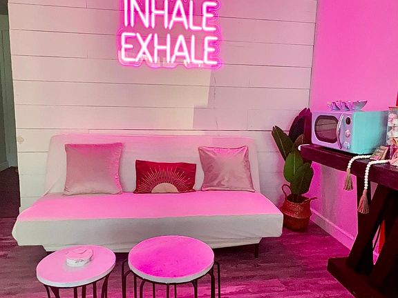 Inside, the unit is a studio with 1 bathroom that presents a full kitchen, we just renovated to there is a sink and kitchen in the unit. This room features a toaster oven, fridge, microwave, coffee station, and electric stove. The smart TV, complemented by ambient neon lighting, creates an inviting space, while a small living room area invites relaxation. As an added perk, housekeeping can be arranged at a negotiated rate or utilize the conveniently located laundry facilities just downstairs.