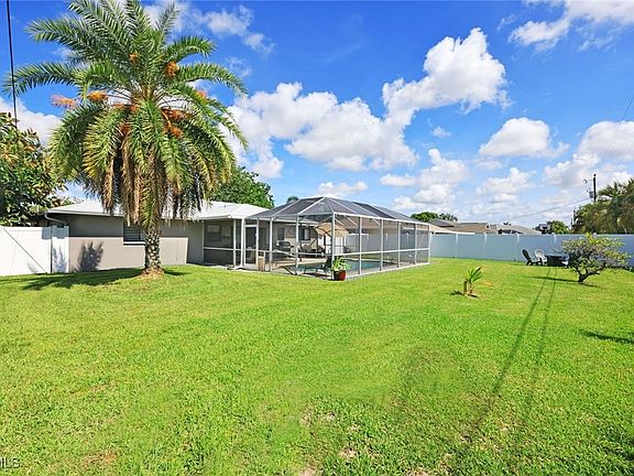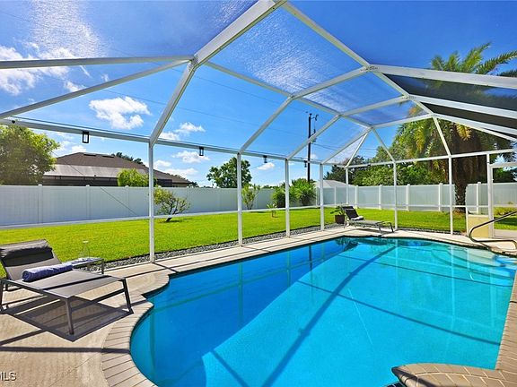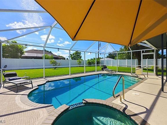 Welcome to this cozy home, turnkey with heated pool and spa, huge fully fenced backyard, situated on a slightly oversized lot in the heart of Cape Coral. Designed to live larger than its stated square footage, the home features a bright and efficient open split-bedroom floor plan, tile and vinyl plank flooring throughout, vaulted ceilings and an abundance of natural light. Pocket sliding doors are leading to a generously sized, covered and screened-in lanai, offering a private and serene setting for year-round relaxation and entertaining. The private fenced yard gives you plenty of space to garden or let kids and pets play safely. Tucked away in a peaceful neighborhood just off Country Club, you're close to everything. Perfectly located near Midpoint Bridge and Del Prado Blvd for quick access to schools, medical facilities, shopping, dining, parks and boat ramps. This is the perfect family home including peace of mind, no flood zone, no flood history, all assessments paid.