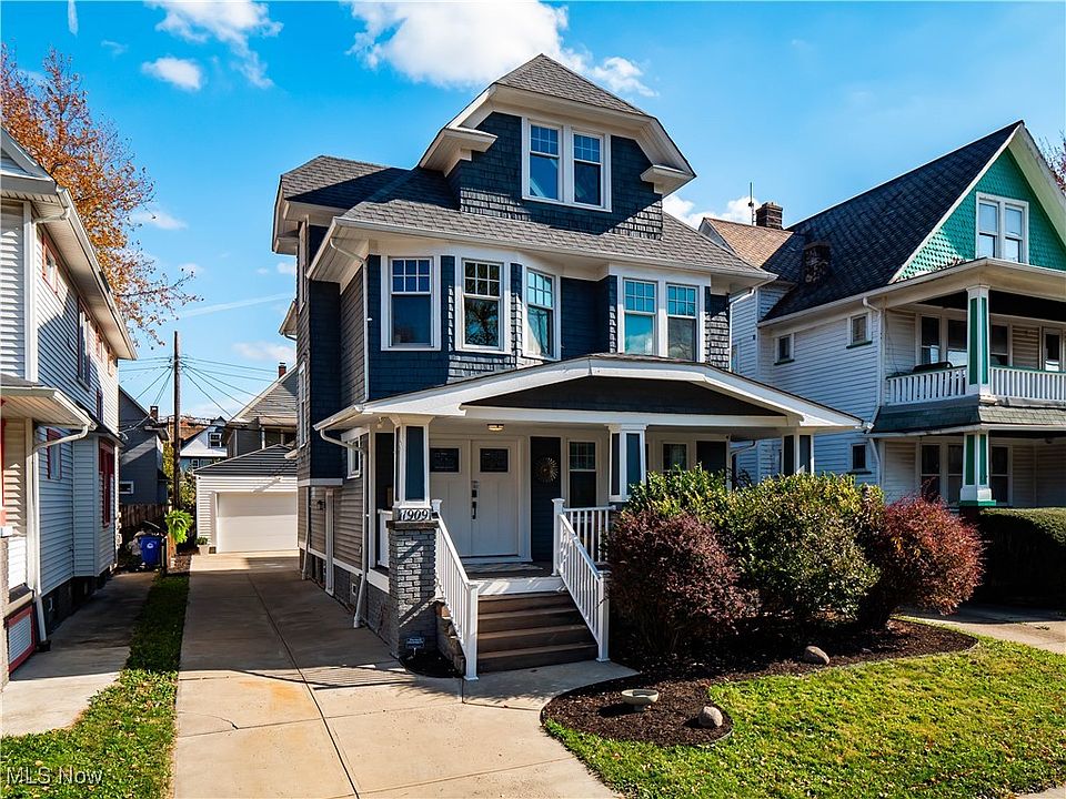 Stunningly restored colonial nestled in the vibrant Detroit Shoreway neighborhood. This home seamlessly blends modern allure with historical charm. Step into the open-concept first floor, where abundant natural light streams throughout the living, dining & kitchen areas, along with LVT flooring, & a cozy fireplace for those chilly Cleveland nights. The heart of this home, the kitchen, is a home chefs dream! Quartz countertops, ample cabinetry, pantry, appliance package inclusive of a gas range & farmhouse sink, all thoughtfully arranged around a spacious dining area. Step through the sliding glass door to access the private patio, ideal for alfresco dining & gatherings. Completing the main floor is a tasteful powder room, underscoring the home's thoughtful design. Venture to the second story to discover two inviting guest bedrooms, each promising size, comfort & closet space. A third room on this floor offers an adaptable office or flex space catering to remote workers requirements or personal hobbies. This second floor is also complemented by a meticulously designed full bathroom featuring a custom tile shower/tub combo & convenient laundry facility. The crowning feature of this home lies on the third floor—the primary suite. Vaulted ceilings & a generous walk-in closet enhance the sense of luxury, while the en-suite bathroom, with its walk-in tile shower & designer floor tiles, promises an oasis of calm & glamour. A full basement offers ample storage & additional laundry area! Outside, the oversized front porch & rear patio present charming spaces for relaxation, accented by greenspace. A detached two-car garage provides convenient parking & storage solutions. Enhancing its financial appeal this home offers Tax abatement 2035! With updated HVAC, electrical systems, windows, roof, plumbing, fixtures, & appliances all under five years old—it assures modern convenience & peace of mind. Proximity to Edgewater Park, downtown Gordon Square all within walking distance!
